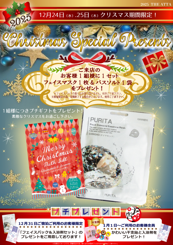 12/24(水).25(木)の2日間限定クリスマスイベント開催! ご来店のお客様1組様に1セット、フェイスマスク&バスソルト1袋をプレゼント♪ 素敵なクリスマスをお過ごし下さい☆彡